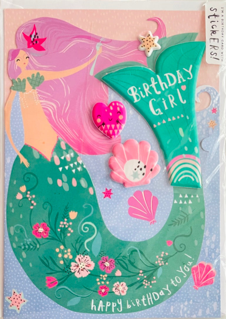 Happy Mermaid Birthday Girl Card with Stickers Shell Starfish Heart Hotchpotch