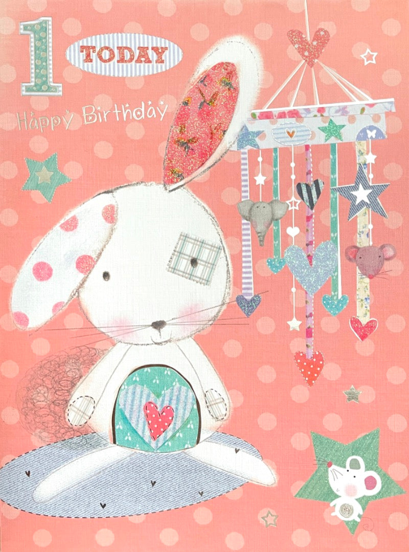 Girl 1 Today Happy 1st Birthday Extra Large Card - Adorable Bunny Rabbit and Cute Mouse