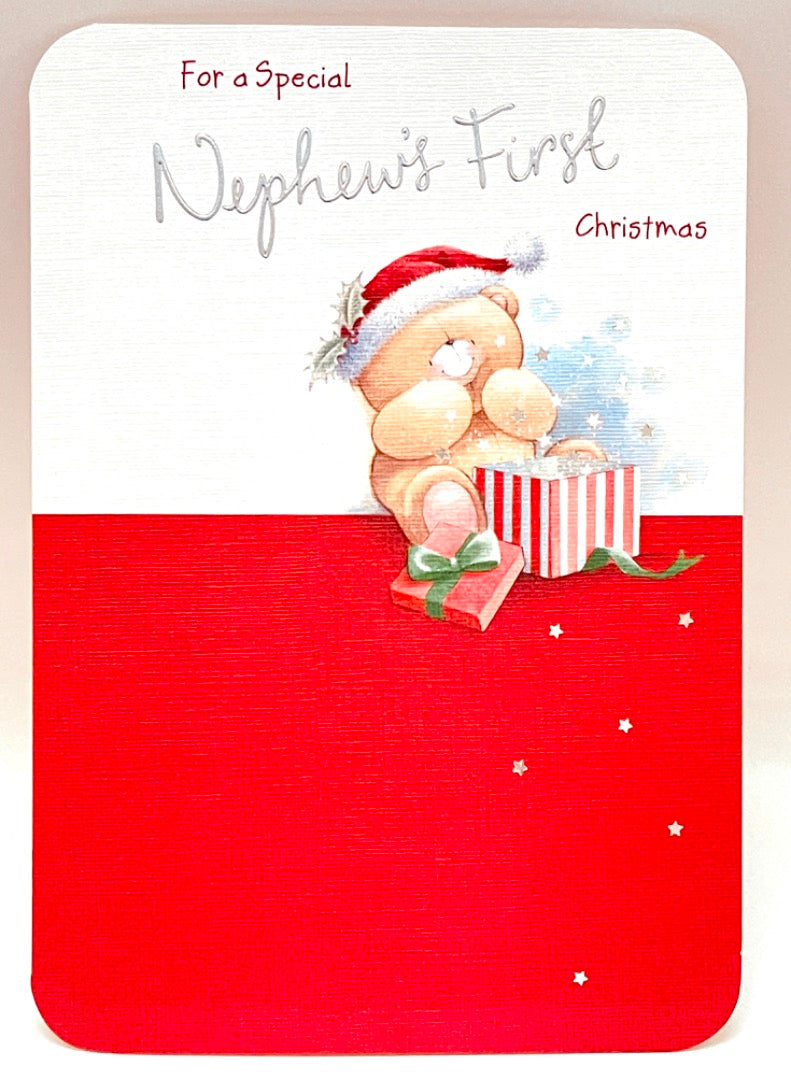 Special Nephew's First Christmas Card Forever Friends Cute Bear with Gift Hallmark