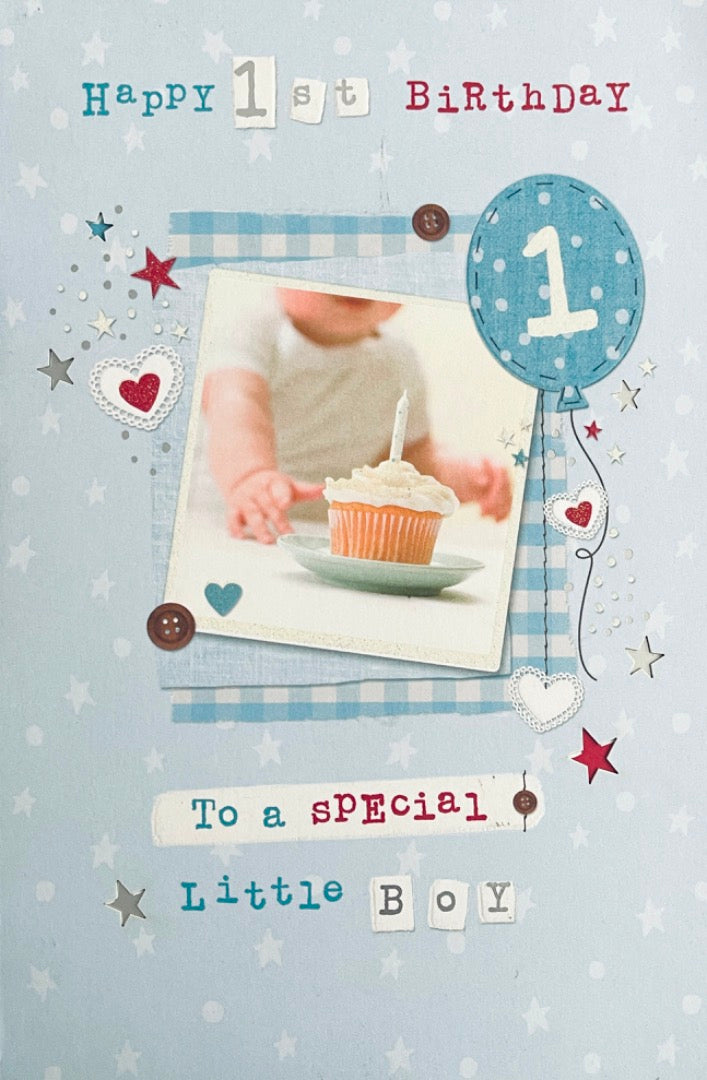 Happy 1st Birthday To A Special Little Boy Fold Out Card with Cupcake and Balloon - Love and Cuddles
