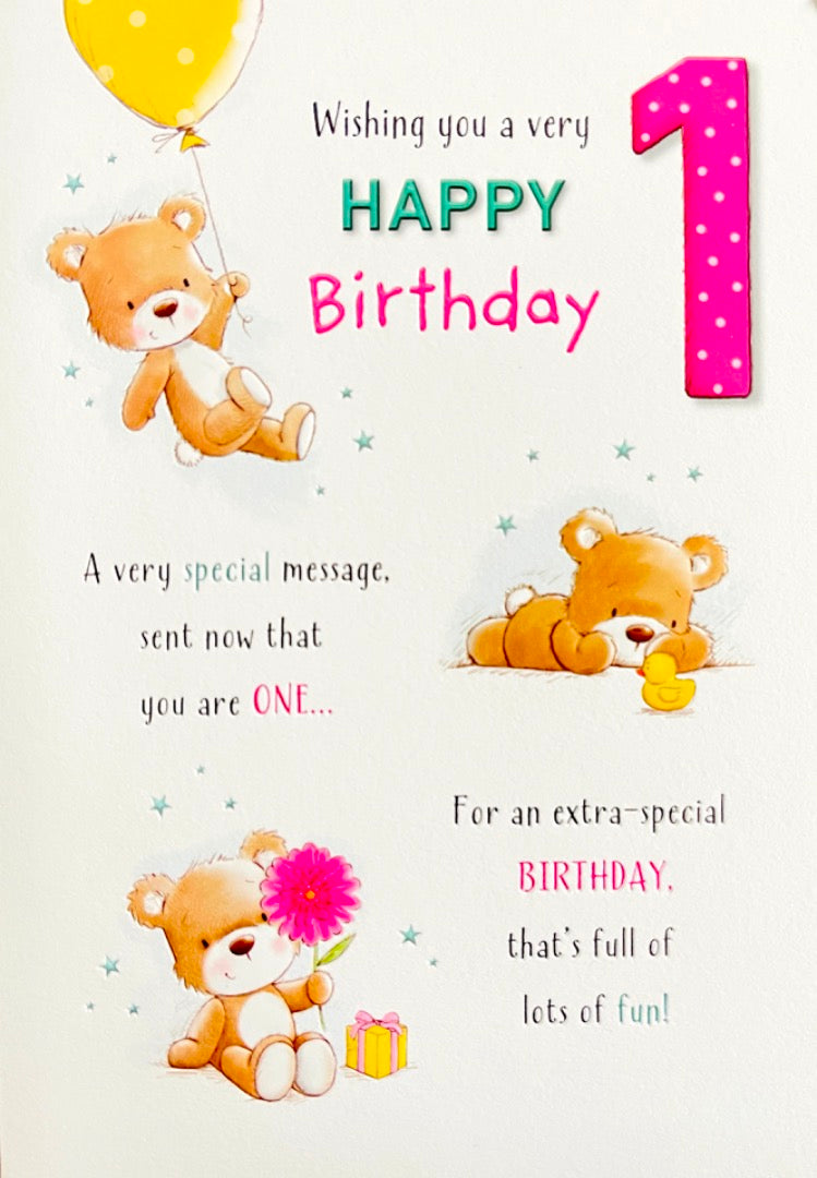 Happy 1st Birthday Little Bear Pink Flower Yellow Duck and Balloon