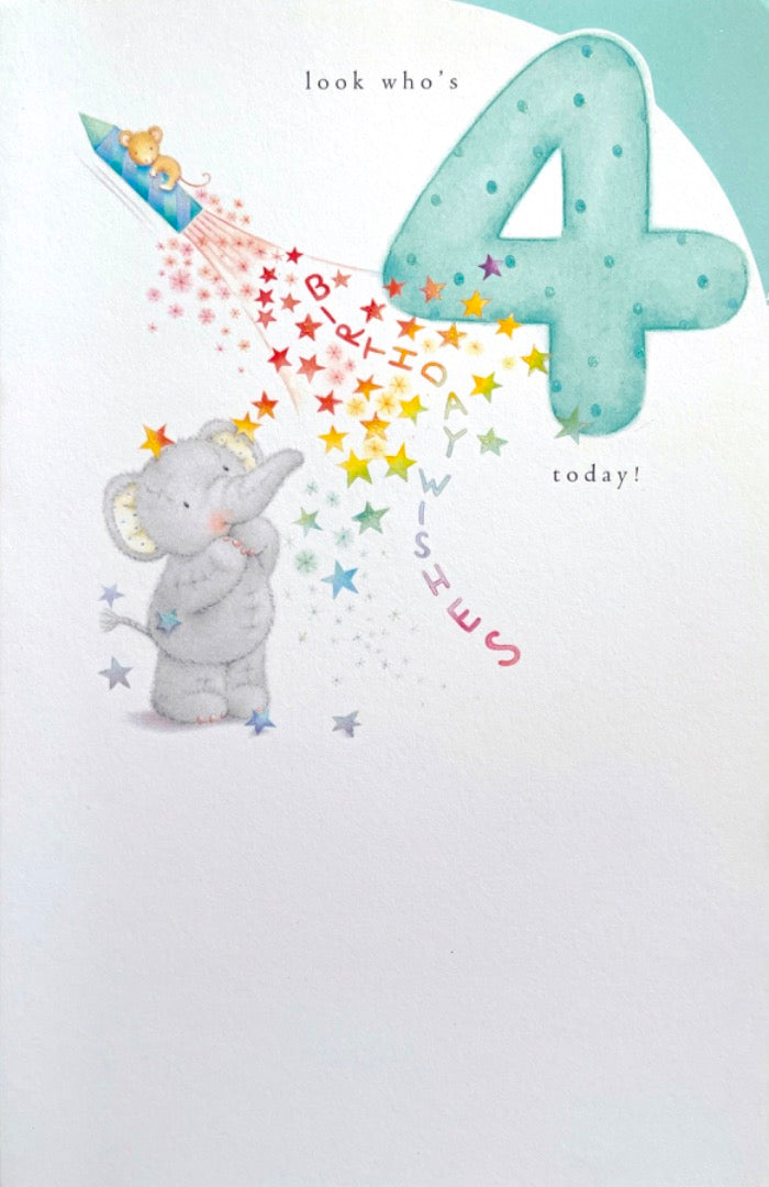 Look Who's 4 Today 4th Birthday Card Elephant Mouse with Rocket Elliot and Buttons