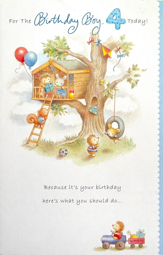 Happy 4th Birthday Boy 4 Today Card Treehouse Party Cute Woodland Friends Age 4
