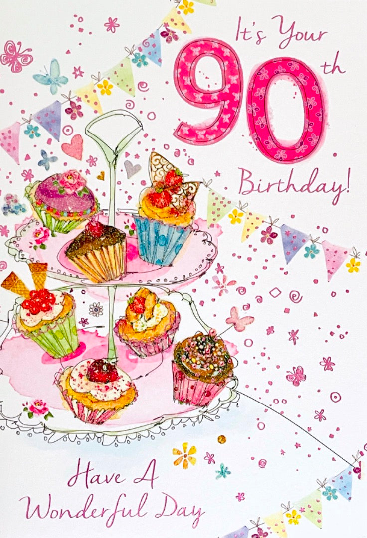 It's Your 90th Birthday Greeting Card - Cupcakes and Sparkle Foil Glitter Art