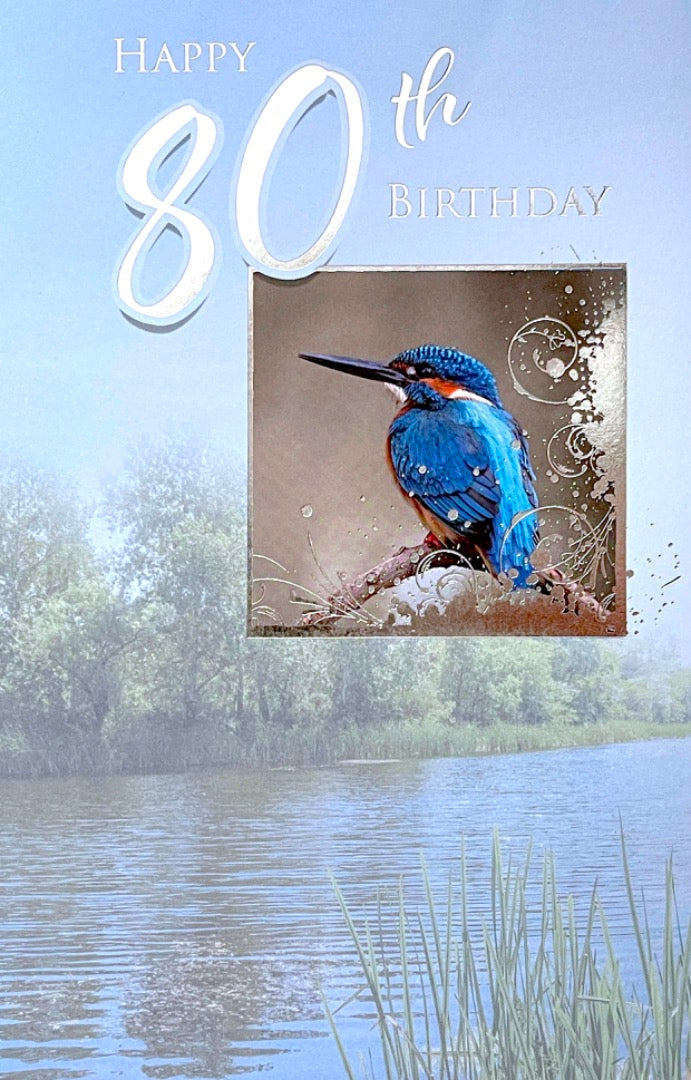 Happy 80th Birthday Card Kingfisher Bird Lake Art Milestone Age 80