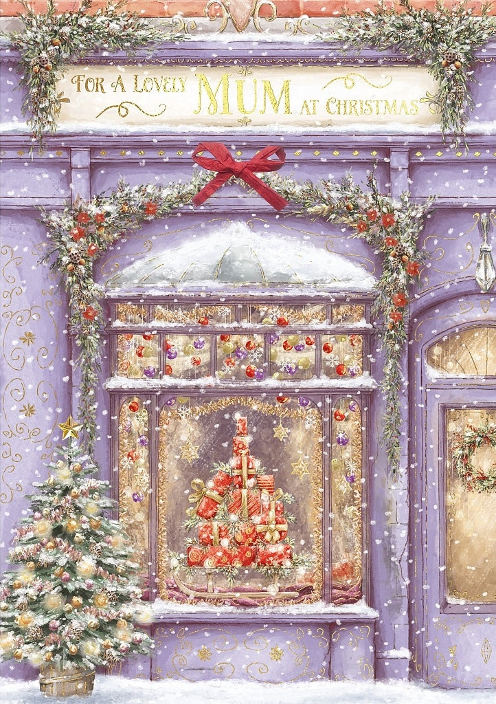 For a Lovely Mum - Festive Window Shopping Large Luxury Hand Finished Christmas Card with Red Ribboned Bow and Gold Foiled Lettering - XHNWW047