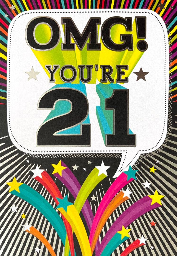 OMG! You're 21 Happy 21st Birthday Blank Card Modern Contemporary Starburst Stars