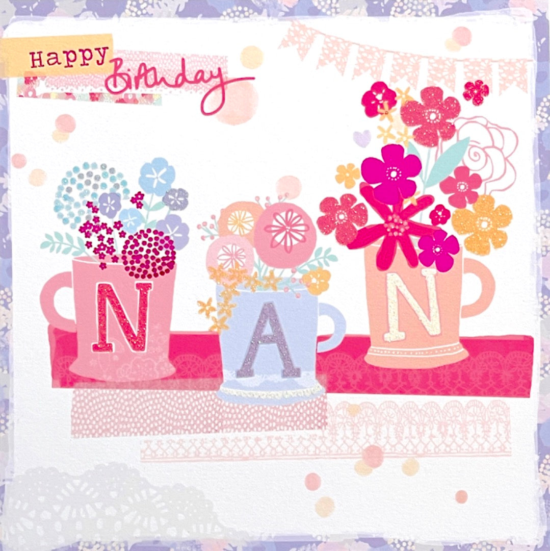 Nan Happy Birthday Card Mugs With Flowers and Buntings Glitter Foil Art
