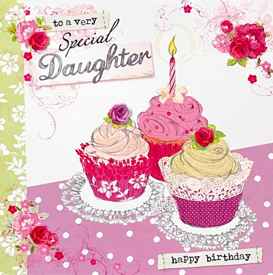 To A Very Special Daughter Happy Birthday Blank Card Cupcakes Flowers Glitter Art