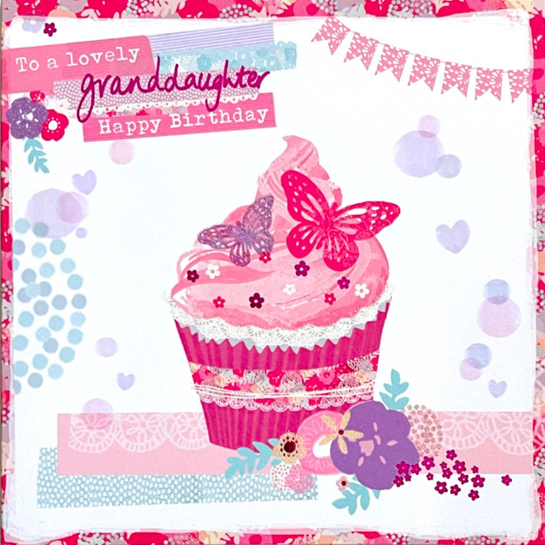 Lovely Granddaughter Happy Birthday Blank Card Cupcake and Flowers Glitter Art