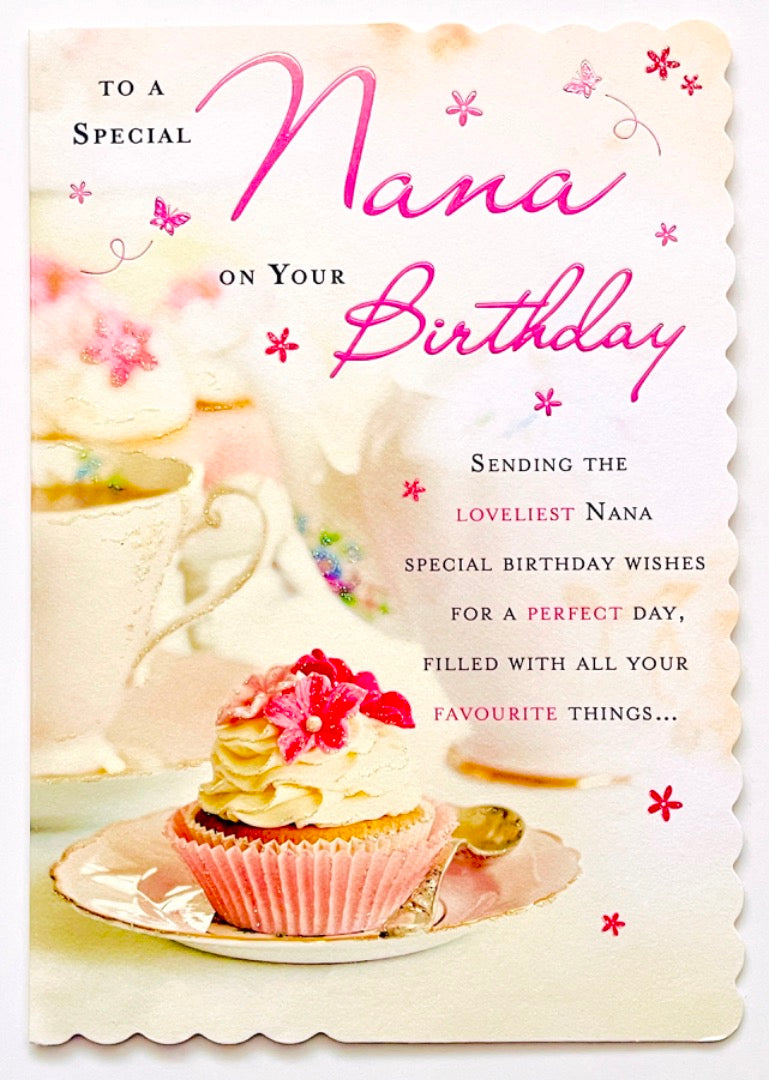 To A Special Nana on Your Birthday Sentimental Card - Tea and Flower Cupcake