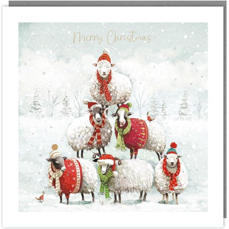 Pyramid of Sheep in Wholly Hats & Scarves - Foil Finish Eco-Friendly Pack of 5 Christmas Cards