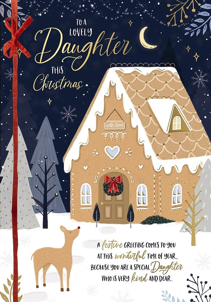 To a Lovely Daughter - Gingerbread House Hand-finished with Love Christmas Card - Red Ribbon - Gold Embossed