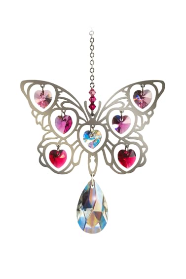 Butterfly Fuchsia Coloured Crystal Hearts Large Chrome Motif Hanging Sun-Catcher - Handmade with Crystal Pendant