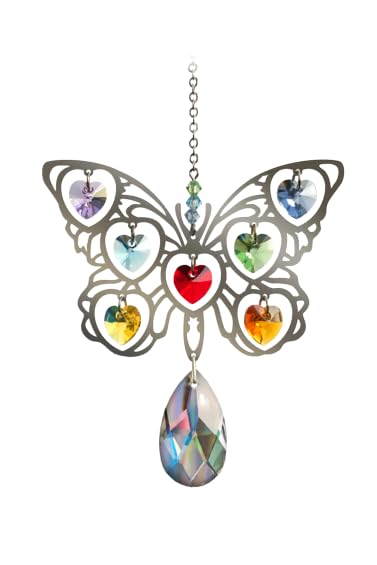 Butterfly Large Chrome Motif with Crystal Hearts - Hanging Sun-Catcher Rainbow Maker Mobile - Handmade with Crystal Pendant