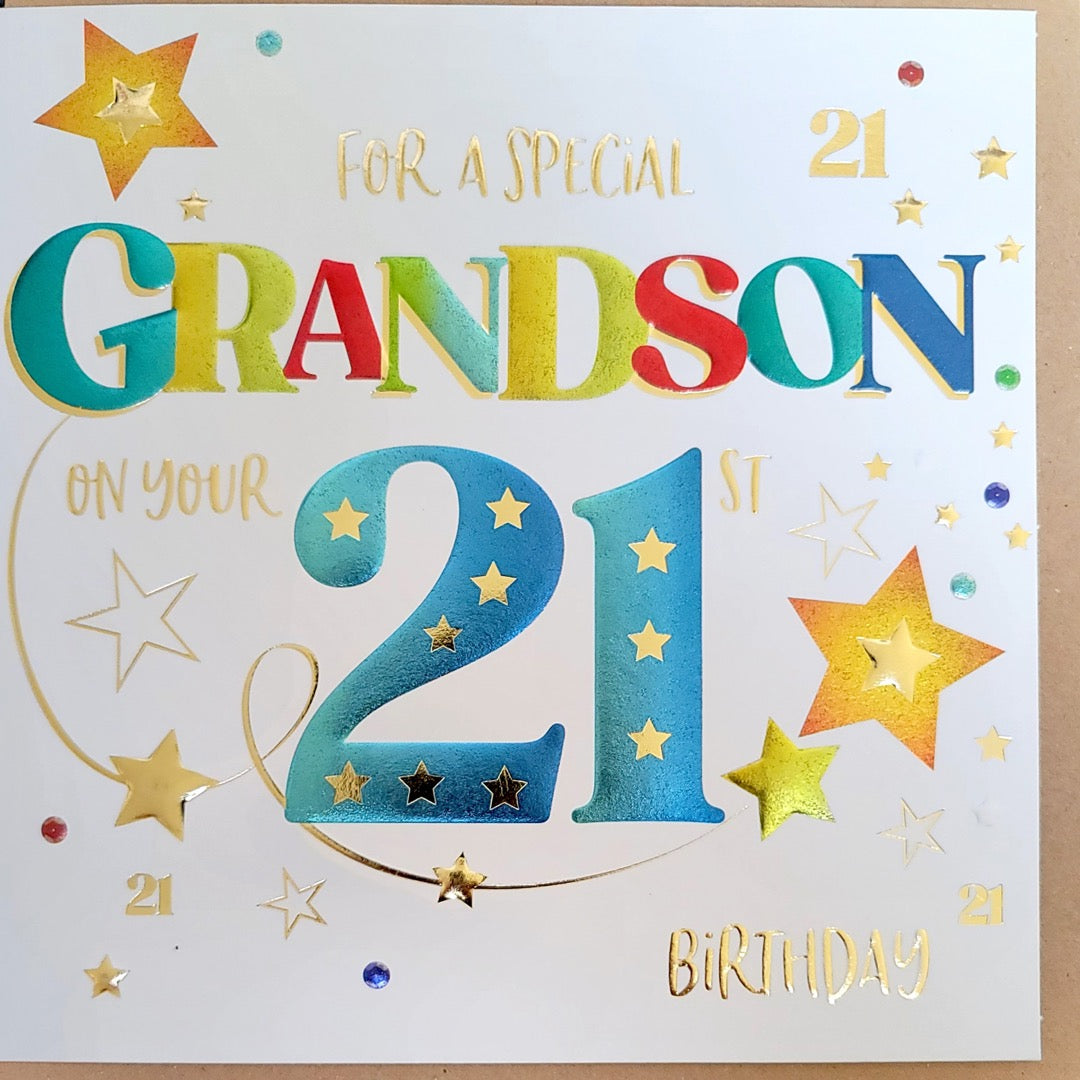 21st Special Grandson 21 Birthday Handmade Greeting Card Stars and Gifts Handmade with Embossed Foil Finish
