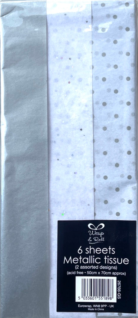 6 Sheets of Metallic Silver and White Tissue Paper Variety by Eurowrap UK - Wrap & Roll