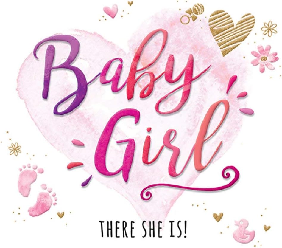 Baby Girl Blank Card - Tiny Feet Duck Rattle Hearts with Gold Flitter - Birth Congratulations