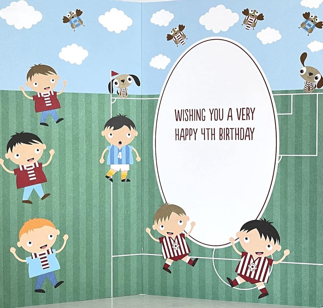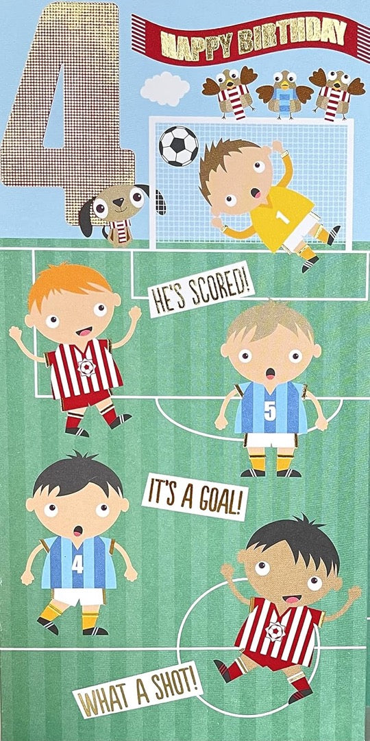 Boy 4 Happy 4th Birthday Card - Football Score, Goal, Shot, Footballers, Dog and Birds Age 4