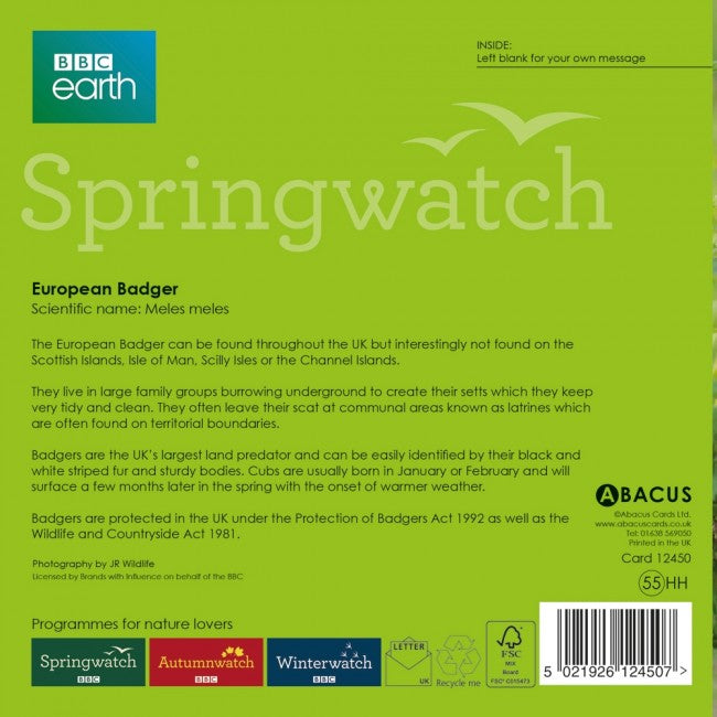 "European Badger" a blank 160 mm square card from the BBC Springwatch range. Printed on smooth board and finished with a gloss varnish. Interesting information, written by the Springwatch team, features on the reverse of the card.