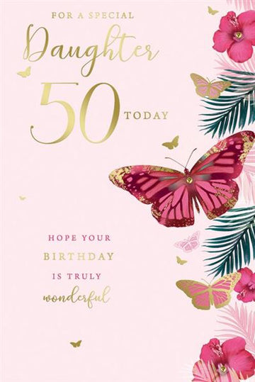 For A Special Daughter 50 Today 50th Birthday Tropical Plants Butterfly Gold Foil Greeting Card