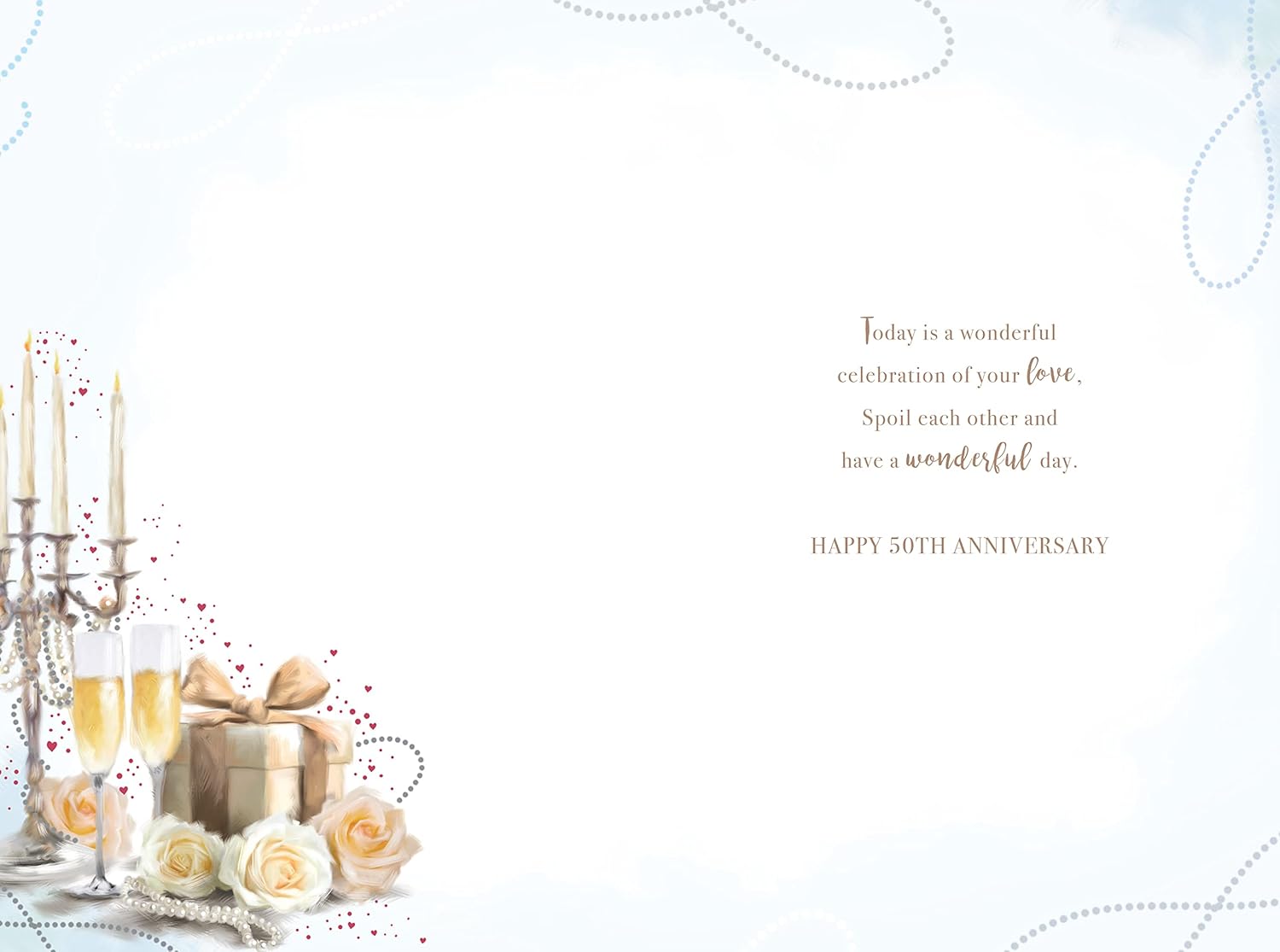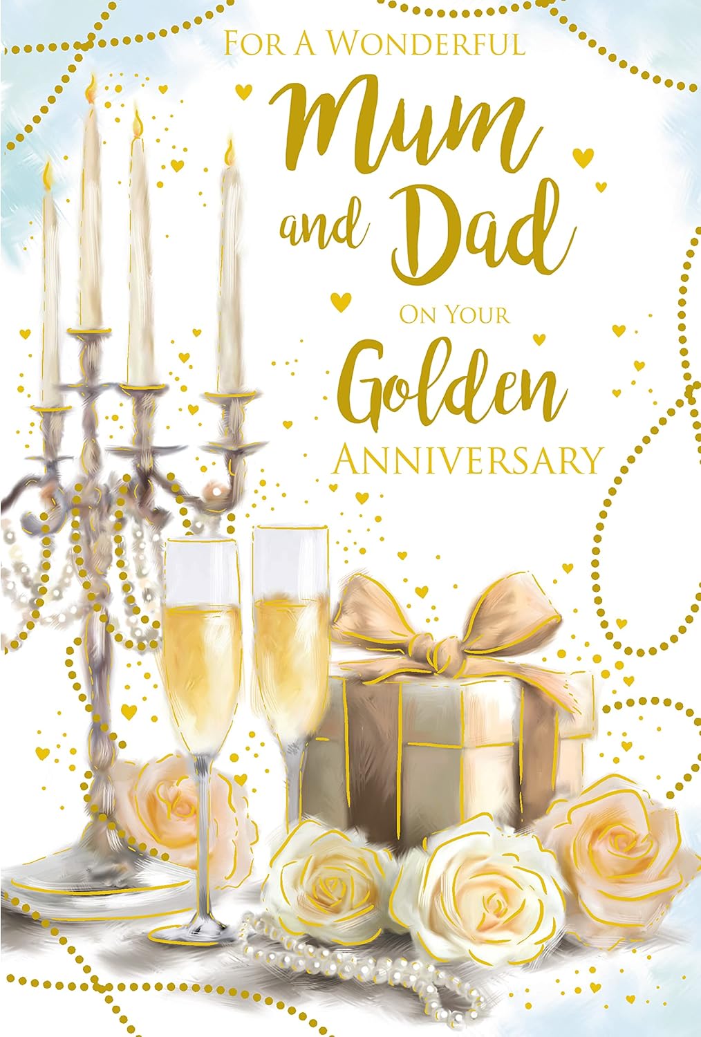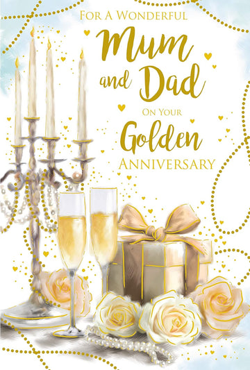 For A Special Mum and Dad on Your Golden Anniversary 50th Candlelight Champagne Roses Gift Gold Foil Art Greeting Card
