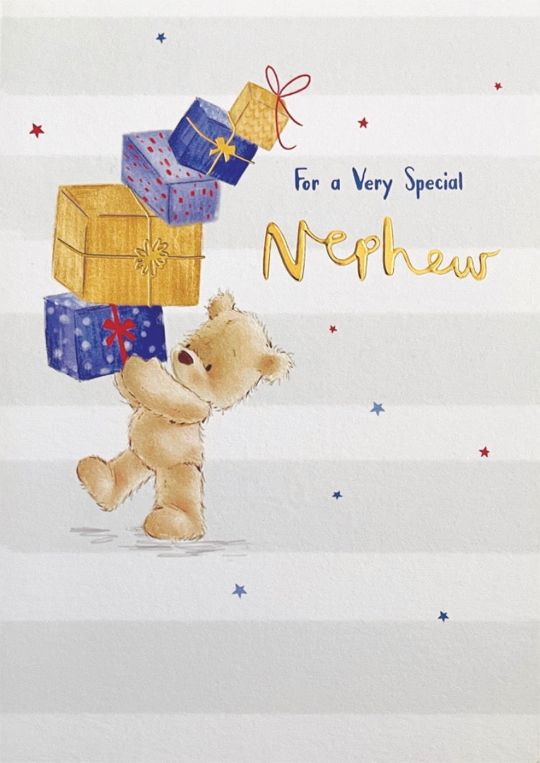 For A Very Special Nephew Happy Birthday Card Cute Teddy Bear With Gifts Nutmeg