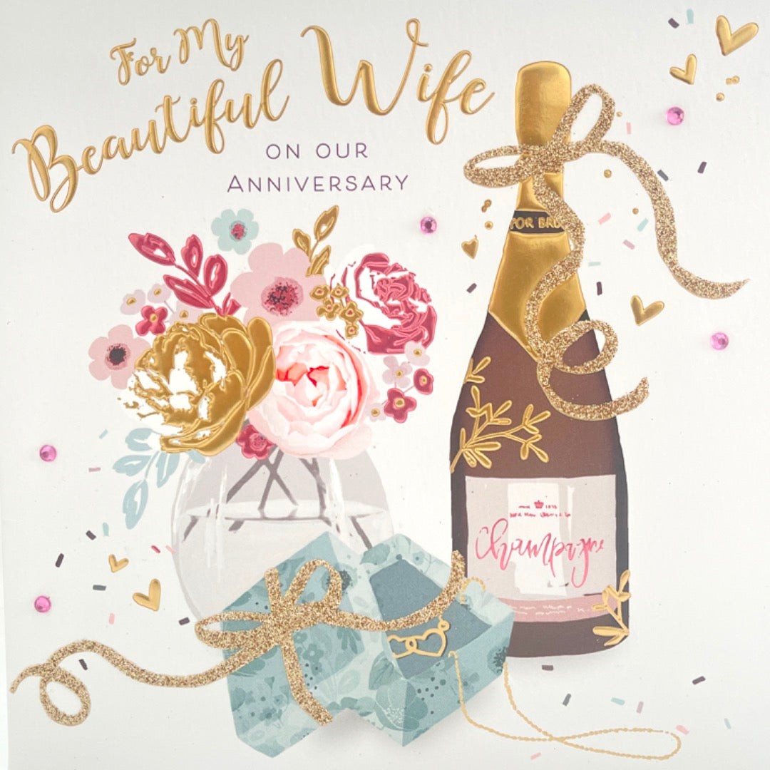 For My Beautiful Wife on Our Anniversary Champagne Roses Gold Foil Greeting Card