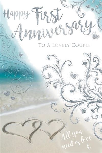 Happy First Anniversary To A Lovely Couple Love Hearts on Sandy Beach Silver Foil Greeting Card
