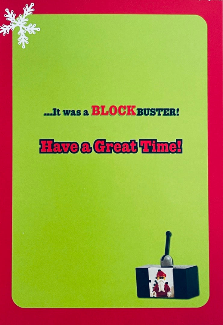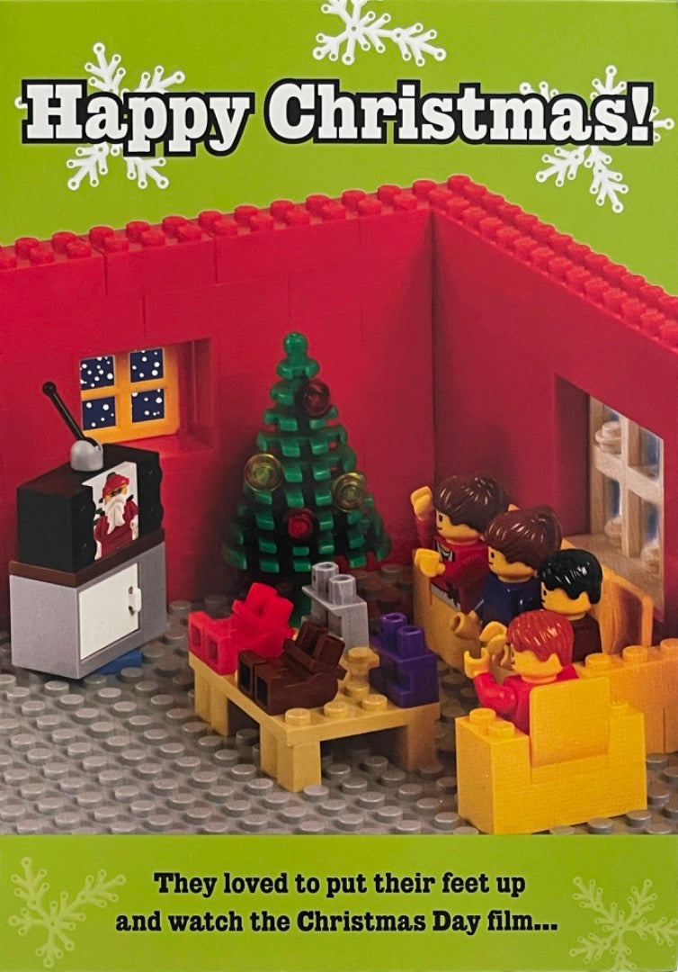Lego Figure Family Friends Feet Up Watching Block Buster Film Happy Christmas Card Hallmark