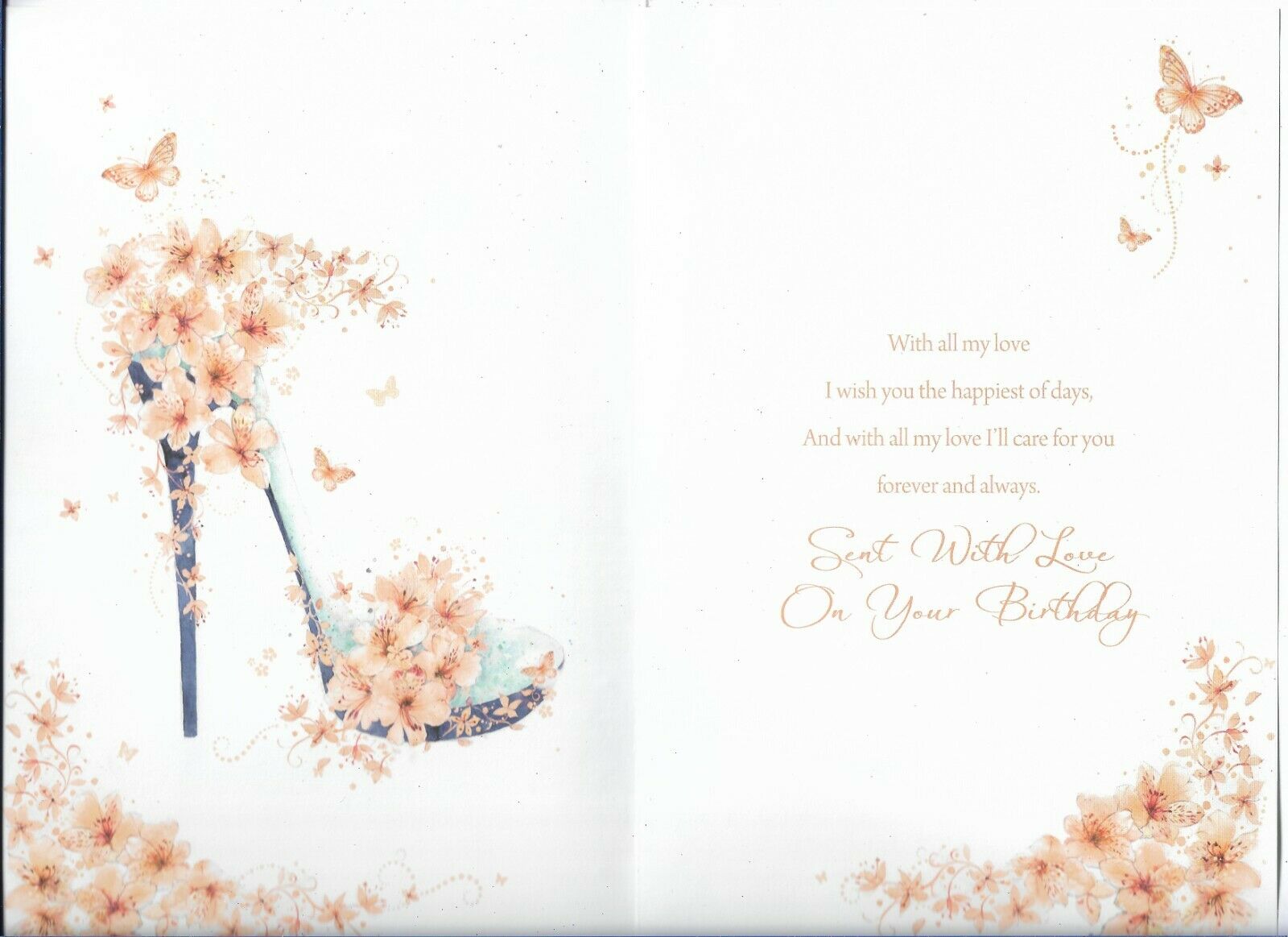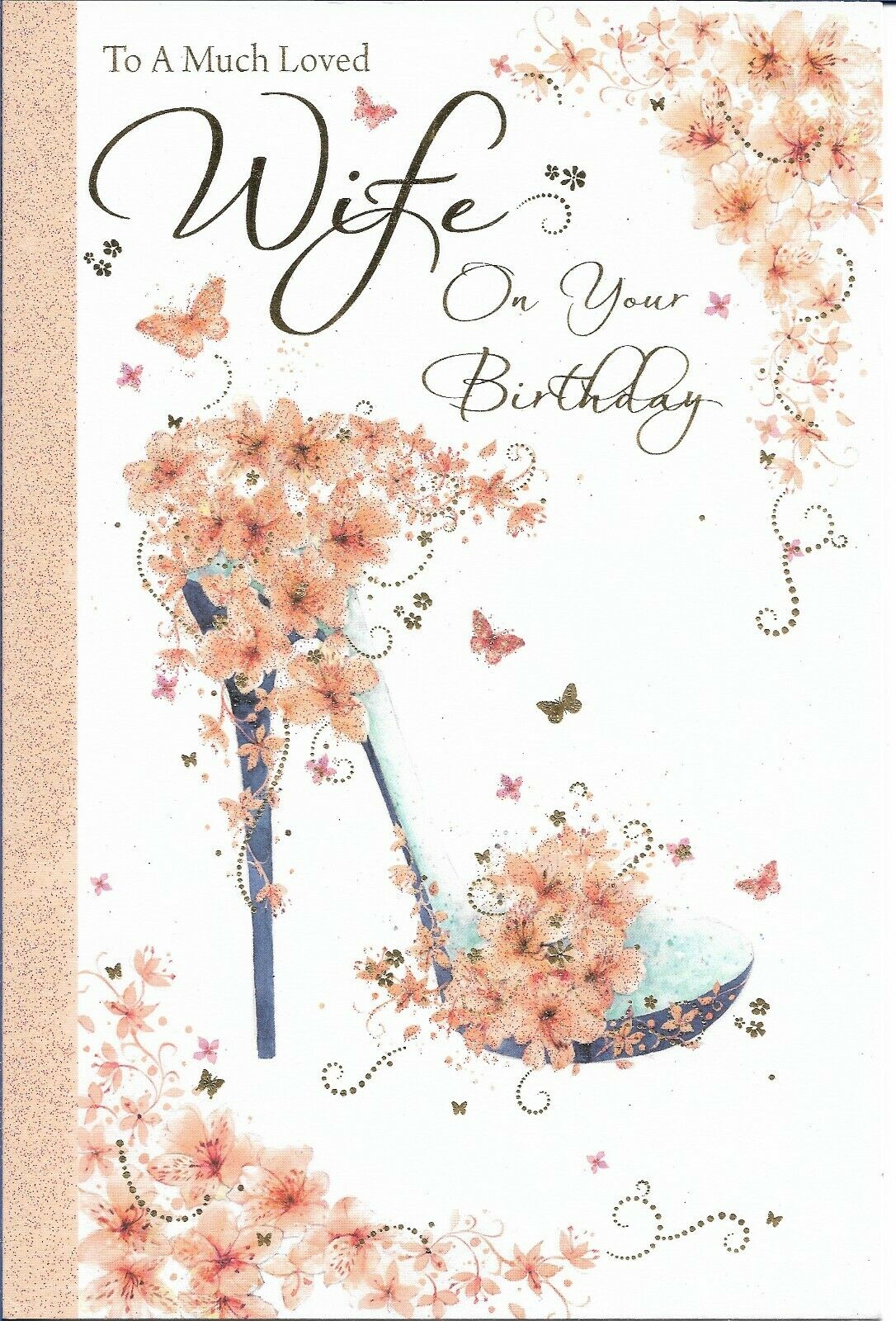 Loved Wife Birthday Greeting Card (ML443) - Female Peach Flowers Stiletto Heel - Glitter Finish - from Cherry Orchard
