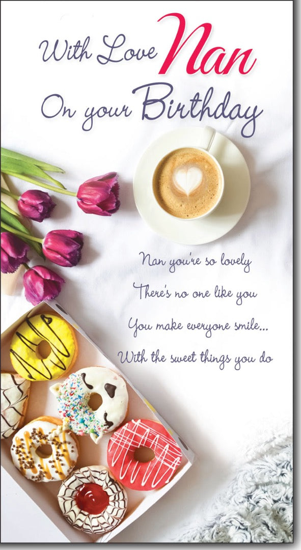 Lovely Nan Birthday Card - Purple Roses, Tea and Donuts with Colour Insert & Lovely Verse