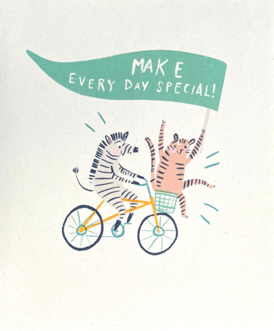 Make Every Day Special Blank Card Any Occasion - I Used to Be A Coffee Cup Eco Friendly - Tiger and Zebra on Bike