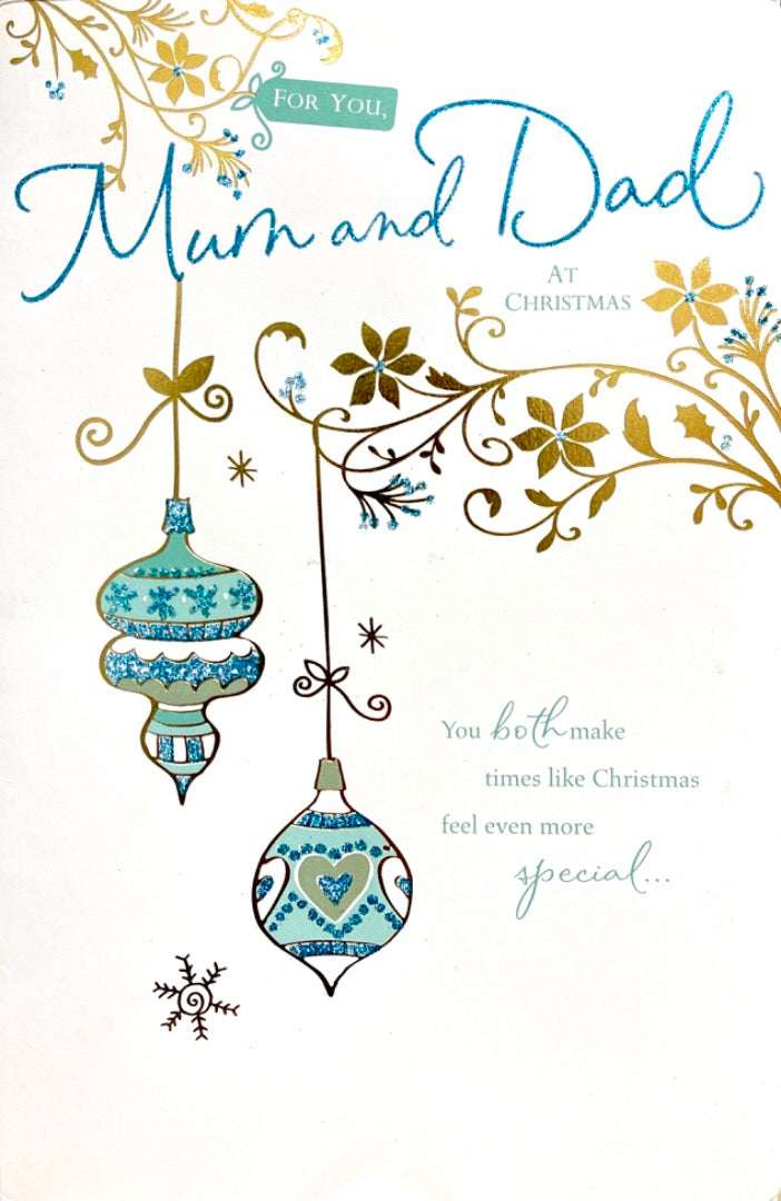 Mum and Dad at Christmas Card Grateful for Parents Contemporary Glitter Baubles