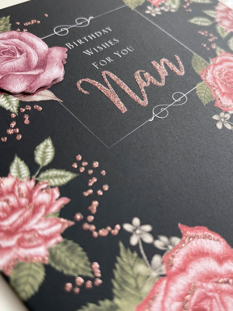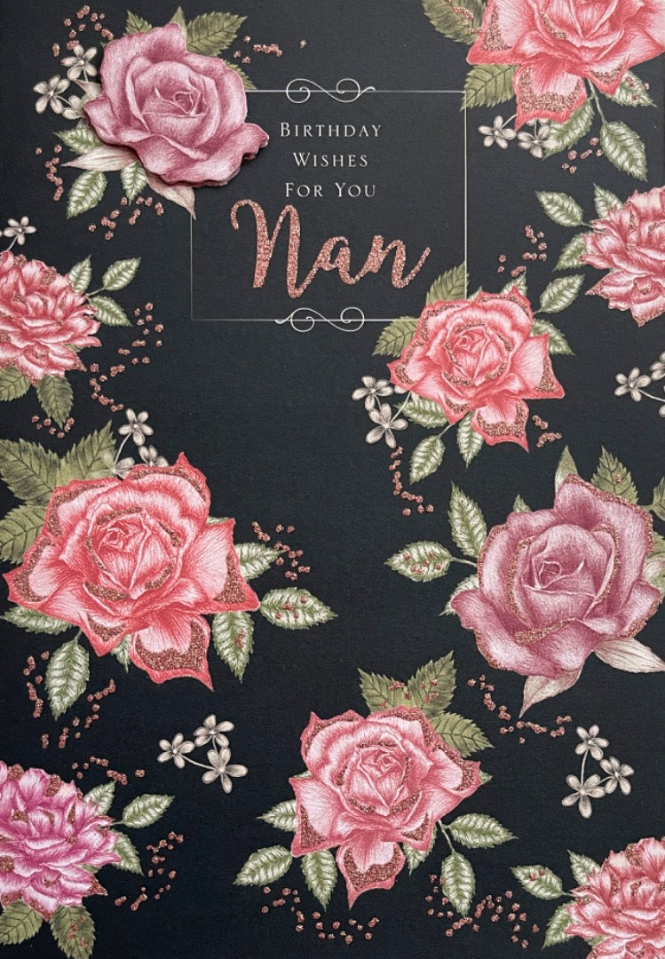 Nan Birthday Wishes Greeting Card with Beautiful Roses Botanical Sparkle Art