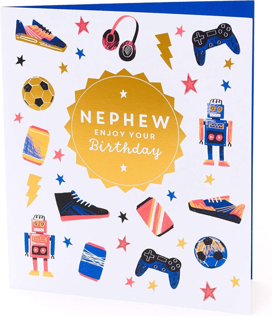 Nephew Enjoy Your Birthday Card - Cool Things Gaming Headphones Robots Football Trainers