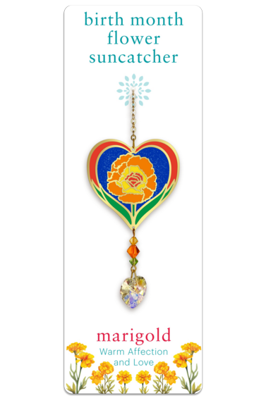 October - Marigold Birth Month Flower Sun-Catcher Mobile - Stained Glass Effect - Sparkling Crystal Heart Adorned - Embellished with Hand-Crafted Beadwork