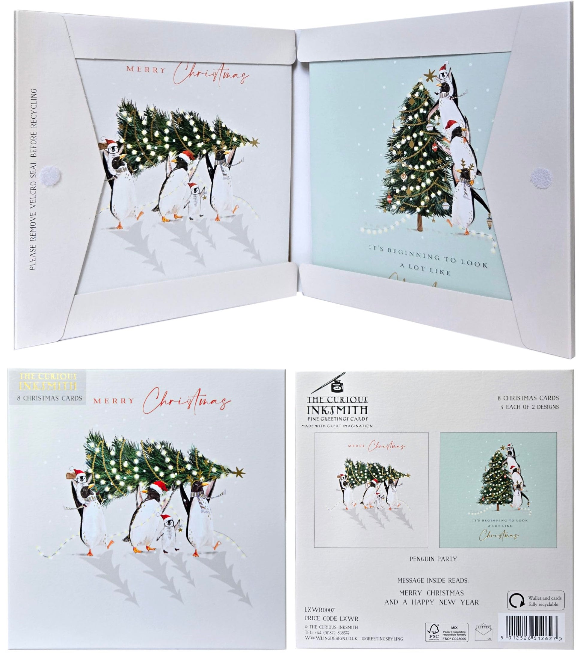 Penguin Party Arts & Crafts Pack of 8 Christmas Cards in 2 Designs by The Curious Inksmith