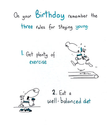 Three Rules Of Staying Young Happy Birthday Funny Humour Card - Exercise, Diet, Lie