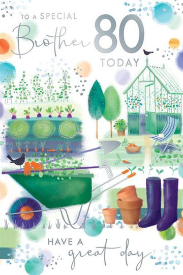 To A Special Brother 80 Today Have A Great Day Gardening Silver Foil 80th Birthday Greeting Card by Kingfisher