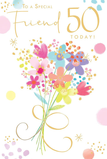 To A Special Friend 50 Today! Beautiful Flowers Gold Foil 50th Birthday Greeting Card by Kingfisher