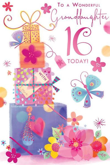 To A Wonderful Granddaughter 16 Today! Special Presents Purple & Silver Foil 16th Birthday Greeting Card by Kingfisher