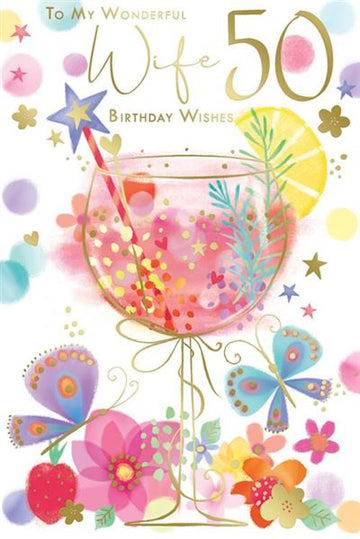 To My Wonderful Wife 50 Birthday Wishes Sparkling Wine Glass Gold Foil 50th Greeting Card by Kingfisher