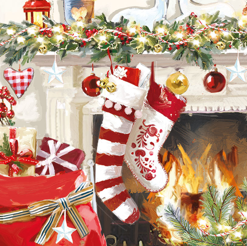 Winter Warmers Stockings Over Fireplace - Pack of 6 Festive Art Xmas Charity Christmas & New Year Greetings Cards